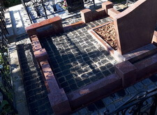 Облицевали бетон полированным гранитом, на территорию участка уложили брусчатку, предварительно приподняв памятник.