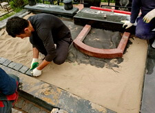 Приступаем к работе с цветниками. Один уже был в наличии, поэтому делаем второй, идентичный. По проекту цветники должны смотреться одинаково даже несмотря на то, что памятники будут разные. В это же время укладываем гранитную брусчатку уже на территорию места захоронения.