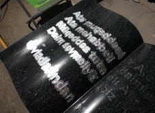 Далее начинается второй этап – переход к созданию элементов памятника. Первая подготовленная деталь – полукруглая арка. Трафарет на арку отпескоструили, сделали надпись сусальным серебром